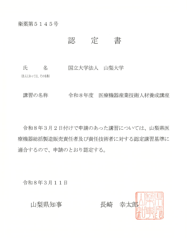 「山梨大学医療機器設計開発士」とは、修了生におくられる名称であり、医薬品医療機器等法に基づく法規制の仕組みや医療機器の開発にかかる、一定の知識を学んだものとして認定しております。
